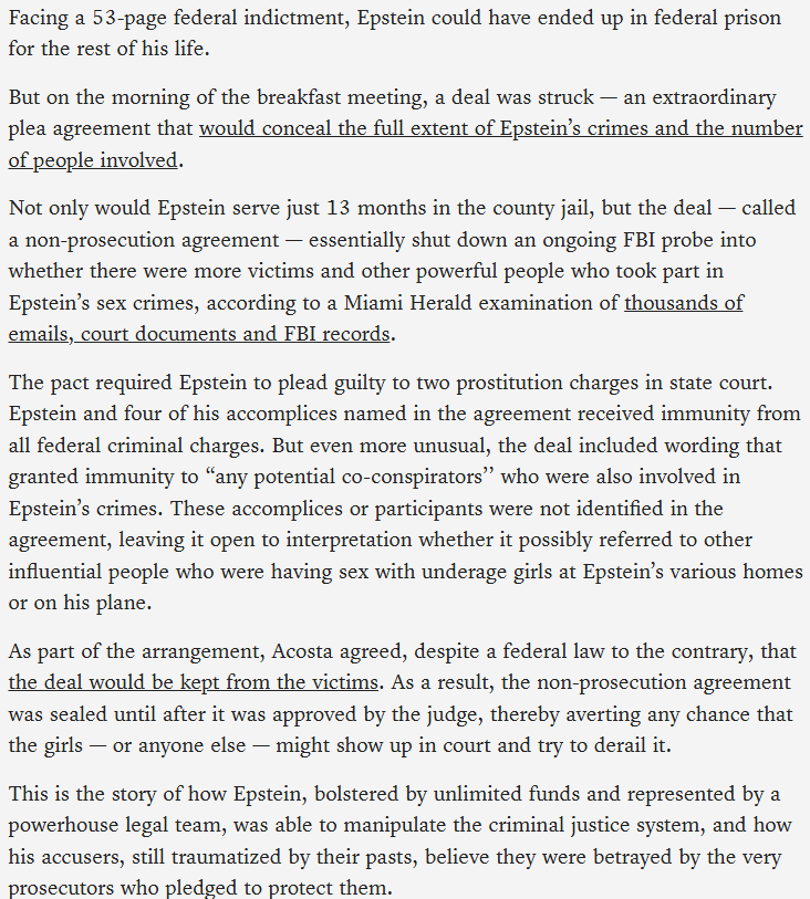 Despite ample physical evidence and multiple witnesses corroborating the girls’ stories, federal prosecutors and Epstein’s lawyers quietly put together a remarkable deal for Epstein, then 54. He agreed to plead guilty to two felony prostitution charges in state court, and in exchange, he and his accomplices received immunity from federal sex-trafficking charges that could have sent him to prison for life.