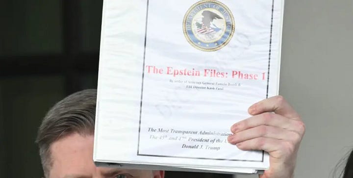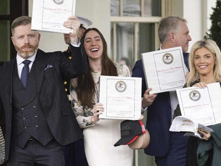 Then there was the “MAGA Influencer” photo op with the folders reading “Epstein Release: Phase One.” Which turned out to contain more redactions and less information, than was already publicly available.