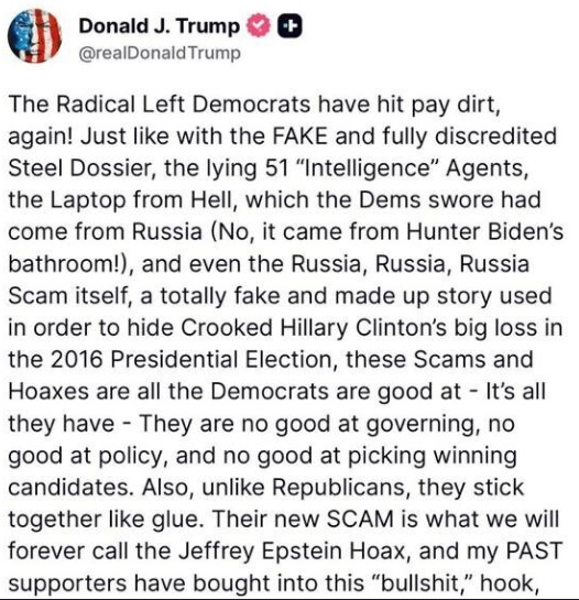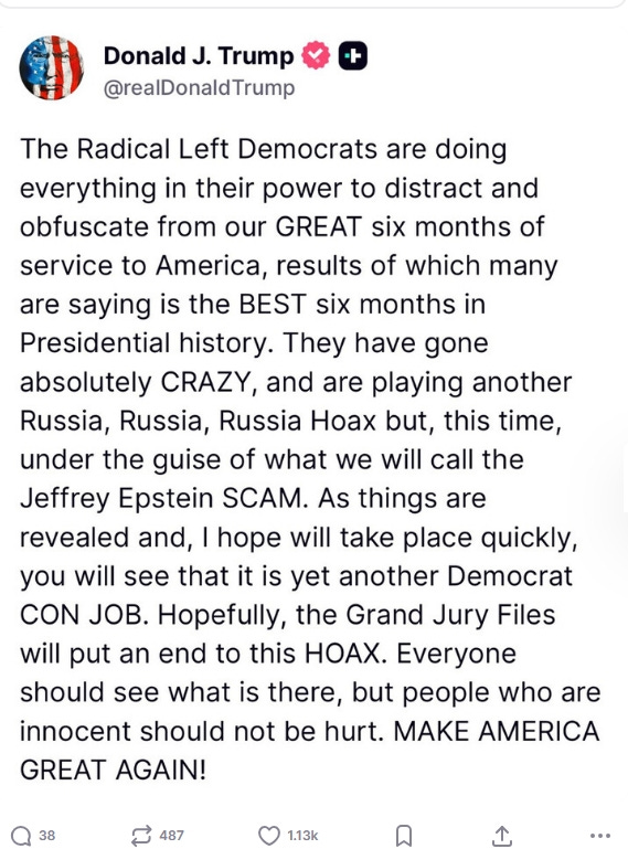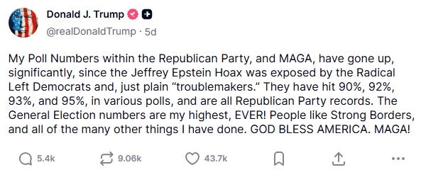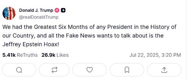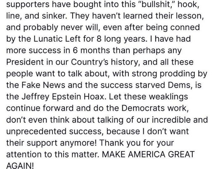 DJT: I mean, I can't believe you're asking a question on Epstein at a time like this. Where we're having some of the greatest success and—and also tragedy with what happened in Texas. It just seems, uh, like a desecration. But you go ahead.