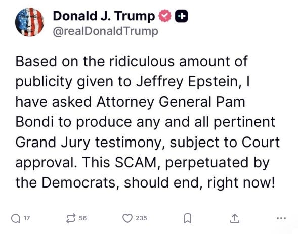 The day following the report above, during a press conference with Trump, AG Bondi, Noem, Hegseth, and Rubio, Bondi is asked about the report, you can see the President kinda fidgeting nervously as the reporter speaks and President Trump interrupts very condescendingly, “Are you still talking about Jeffrey Epstein? …That creep.”