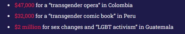 Check out the screenshot below is from another piece I did on this. All sources cited, paid for by the Government-Funded NGO, the National Republican Institute. Because Republicans have historically been interested in “transgender art” and “Sex changes for Peruvians”, right?: